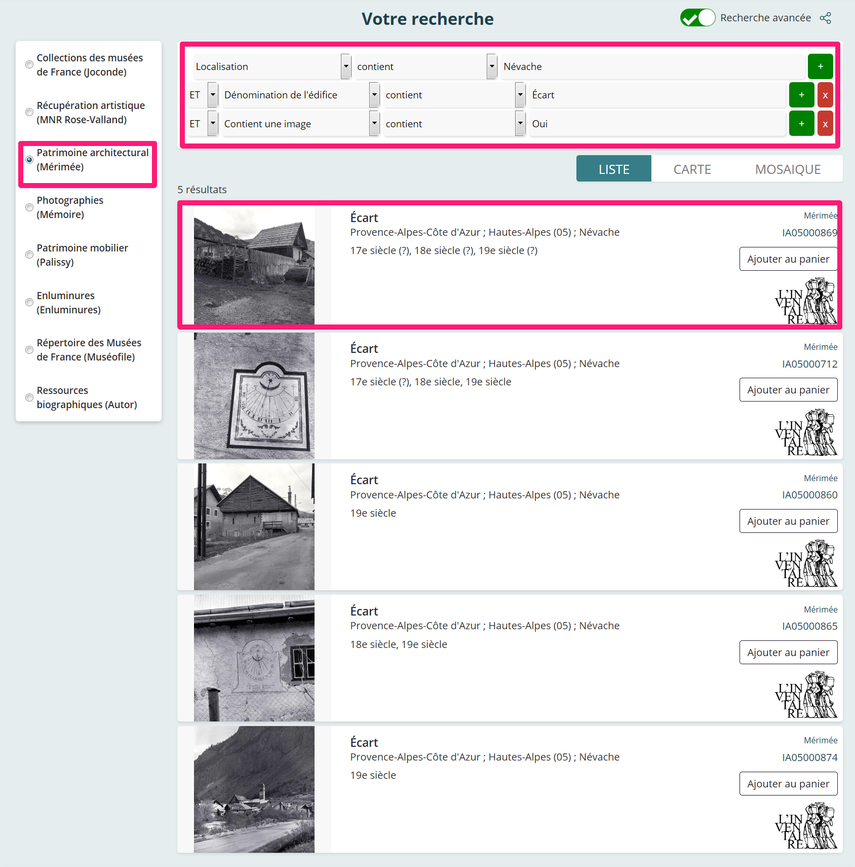 Recherche avancée de la fiche d’inventaire concernant un « écart » à « Névache » sur la base Mérimée. Source : https://www.pop.culture.gouv.fr/gallery/5fc79c54f4f9c50e27b990f2