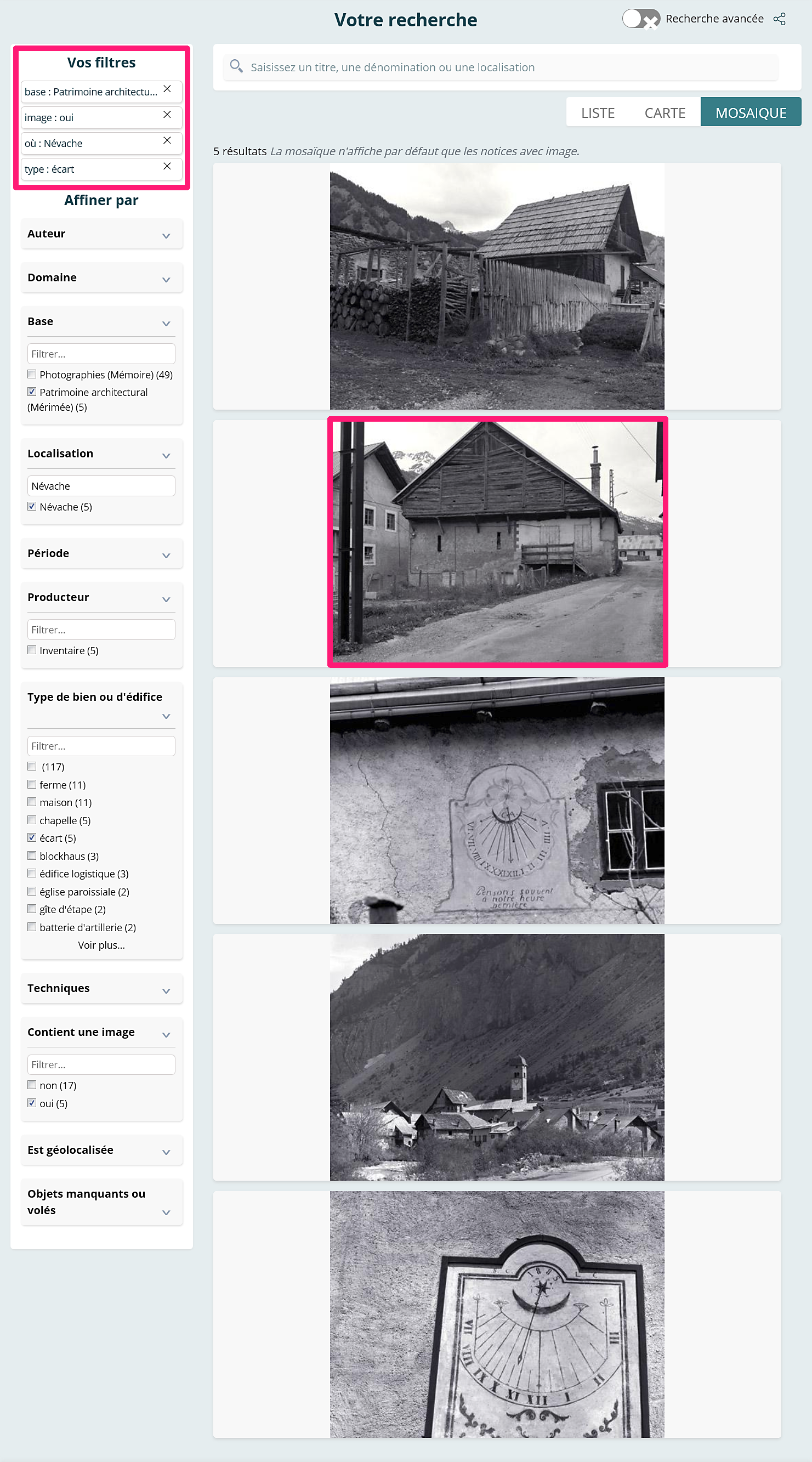 Recherche par filtres de la fiche d’inventaire concernant un « écart » à « Névache » sur la base Mérimée.