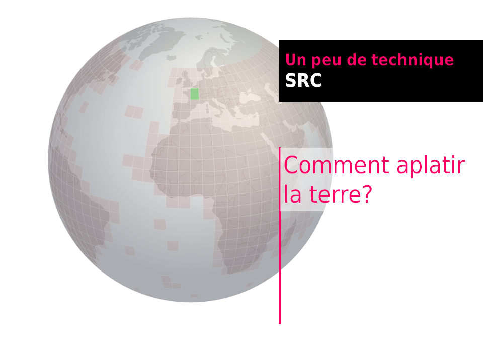 C’est pourquoi, on utilise en SIG différents systèmes de coordonnées de référence (SRC), qui sont autant de systèmes mathématiques permettant de calculer comment on va aplatir la terre sur la portion de territoire qui nous intéresse.