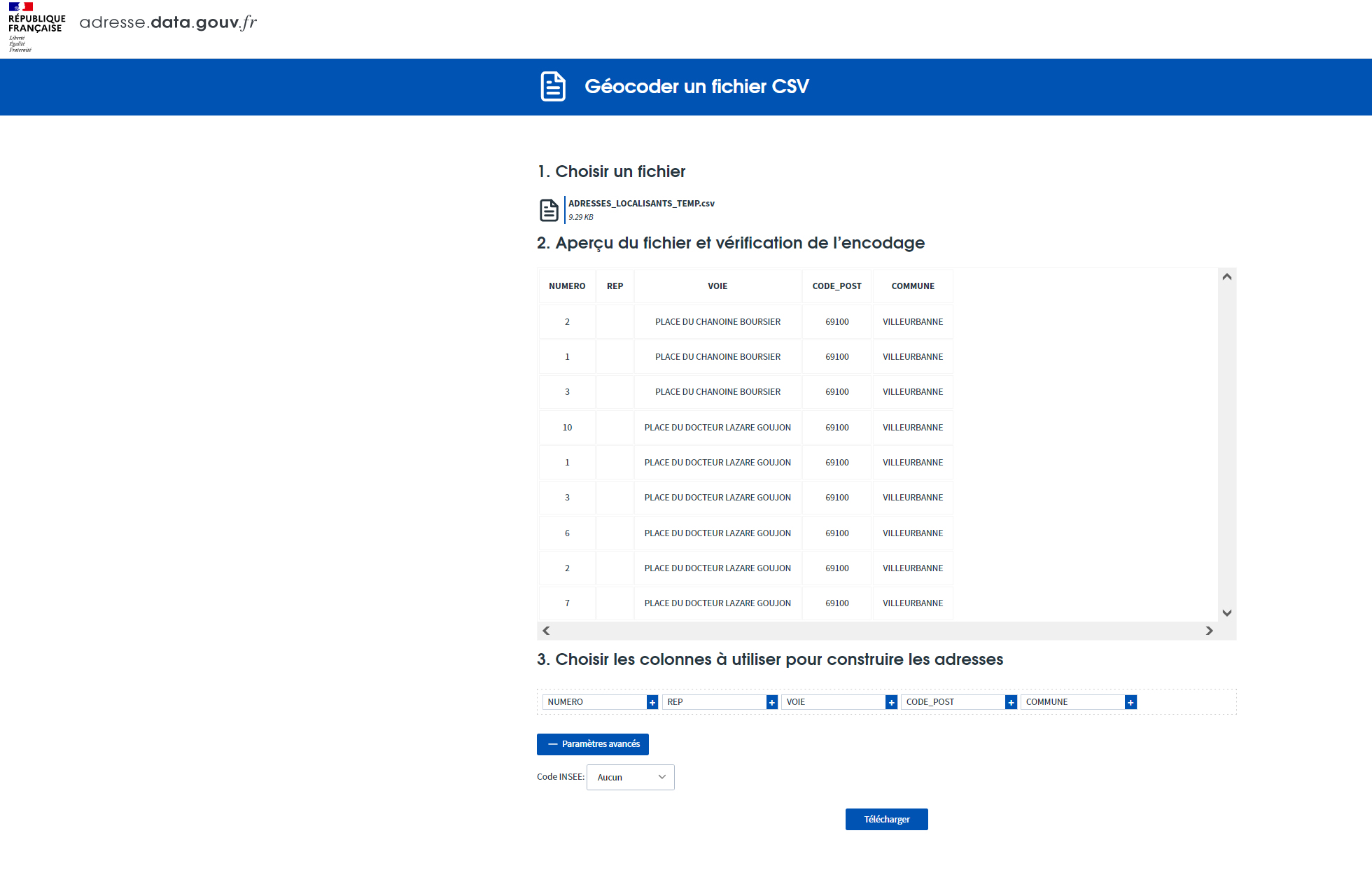 On entre un fichier .csv avec les adresses dans des colonnes et on obtient un autre fichier . csv, complété avec d’autres informations, comme la latitude et la longitude de l’adresse recherchée.