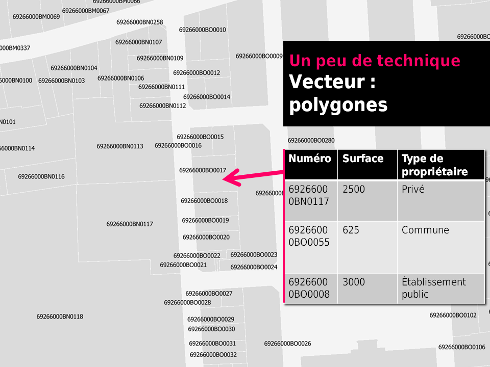 Autre exemple, les cadastres actuels sont des couches de polygones dont les contours correspondent à ceux d’une parcelle. A chaque polygone sont associées des informations contenues dans la table attributaire. C’est ainsi qu’il est possible d’afficher,par exemple, le numéro d’une parcelle cadastrale, en plus de son contour.