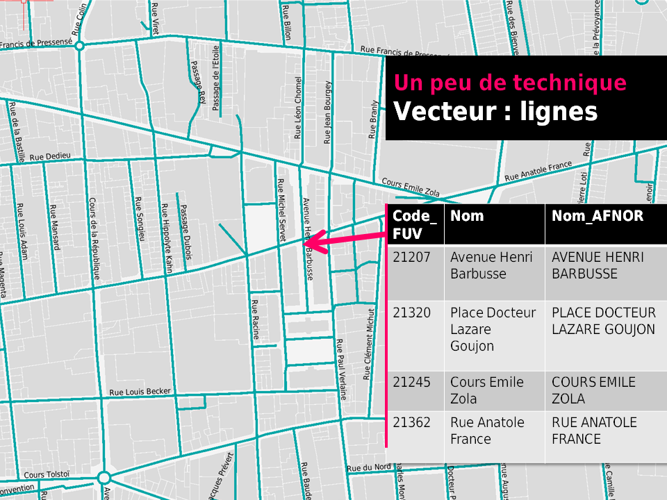Cet exemple des adresses, simple mais très répandu, permet de comprendre les particularités des couches « vecteur » dans un SIG et les possibilités pratiques qu’elles offrent.