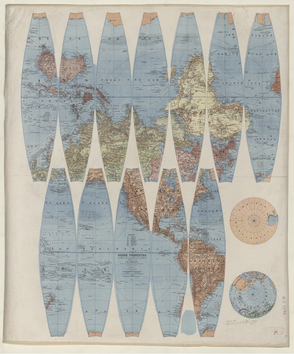 Mais la cartographie de vaste territoires pose un problème supplémentaire : celui de la courbure de la terre. A partir du moment où il a été admis que la terre est ronde, s’est posé un problème mathématique : comment mettre sur une carte plate un surface courbe. C’est alors qu’on été inventés différents « systèmes de projection », c’est à dire différents moyens « d’aplatir la terre » pour la mettre en carte.