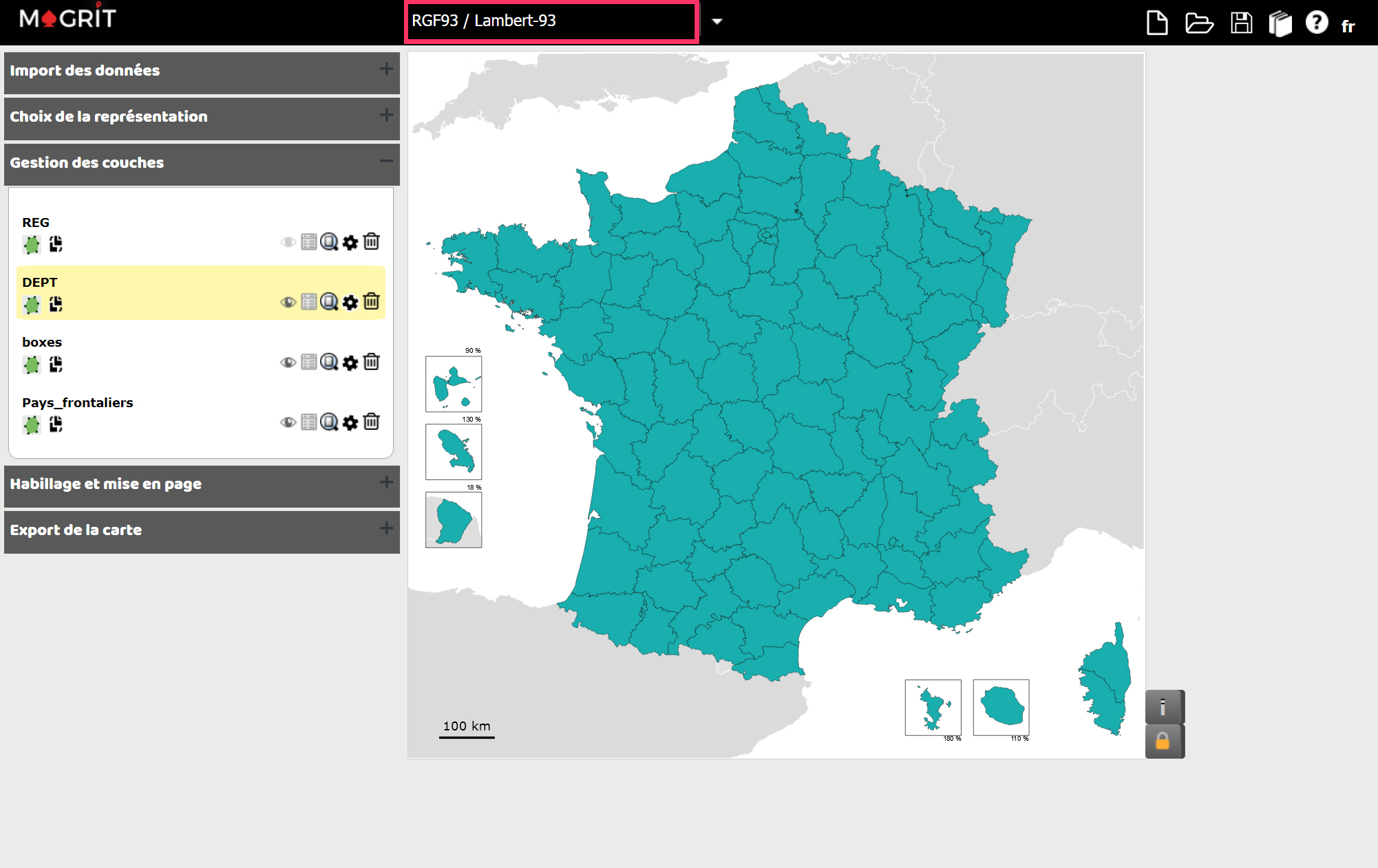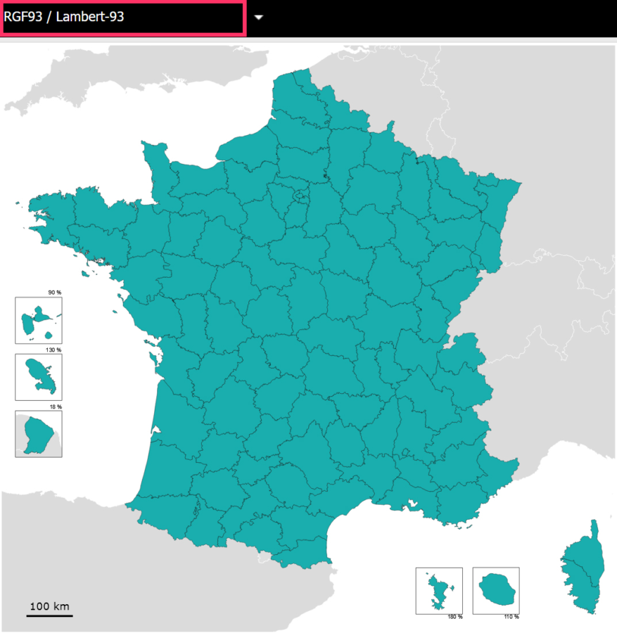 On peut en faire l’expérience en se rendant sur la plateforme en ligne du logiciel Magrit. Sur la première page, il nous propose de choisir des fonds de cartes parmis des « Template cartographiques ». Et l’on peut se rendre sur celui représentant « France Métropolitaine + DOM (Départements / Régions) ». En haut de la page, on peut choisir entre différents systèmes de projections.