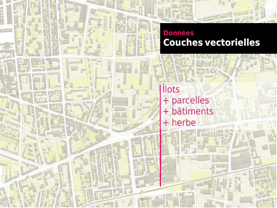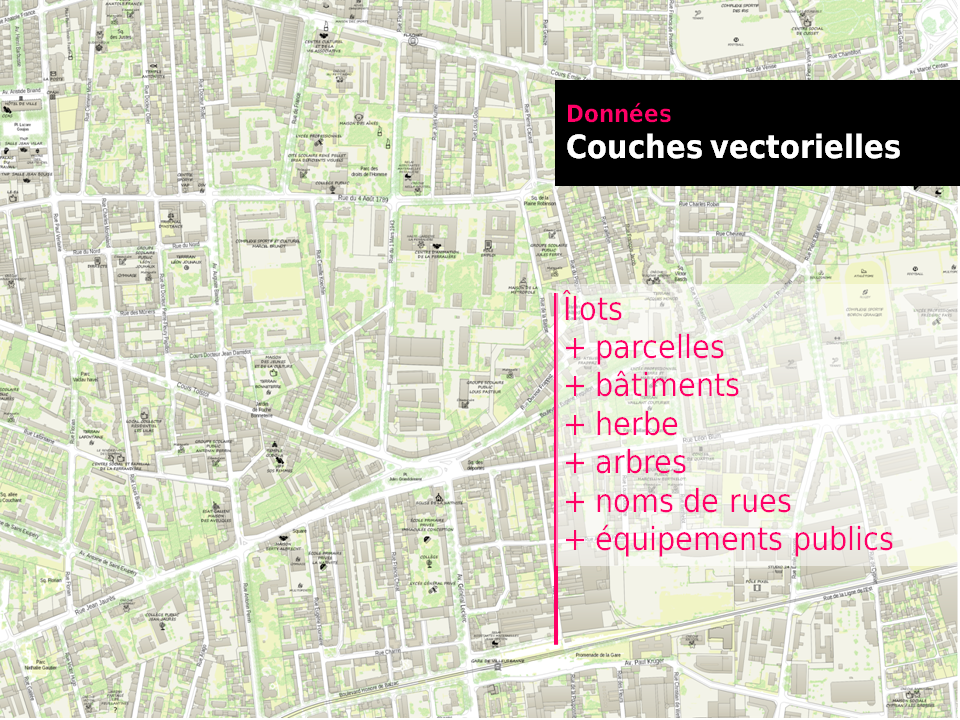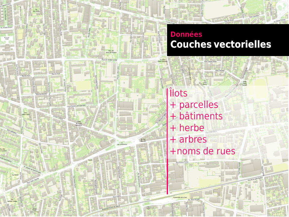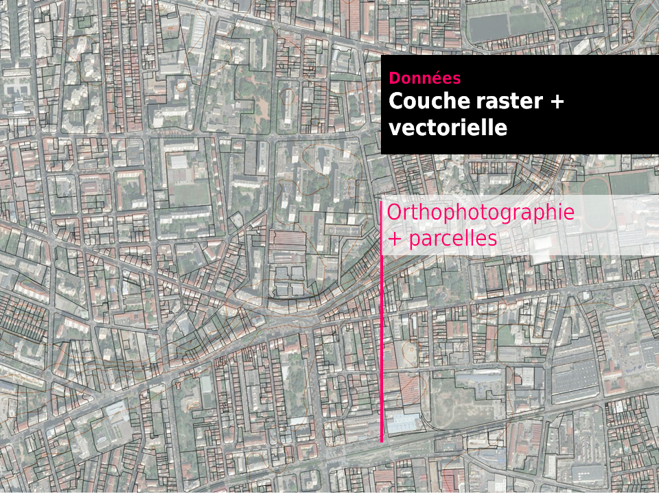 Le plus souvent, pour réaliser une carte, on aura besoin de plusieurs couches de données différentes. Dans l’exemple que nous avons pris, il y en avait trois : une couche de polygones pour les parcelles cadastrales, une couche de lignes pour les voies, une couche de points pour les numéros de voies. Avant de télécharger des données, il importe de réfléchir à celles qui nous serons utiles et sous quelle forme (raster, vecteur).