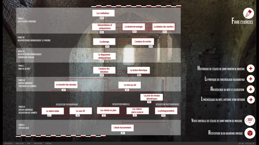 Un webdocumentaire produit par le laboratoire Traces (UMR 5608, Université Toulouse Jean Jaurès), détaille, par exemple, de façon très pédagogique, les techniques de relevé actuellement utilisées en archéologie du bâti. Elles empruntent pour partie leurs outils aux géomètres ou aux architectes, mais certaines ont aussi été créées spécifiquement pour l’archéologie.