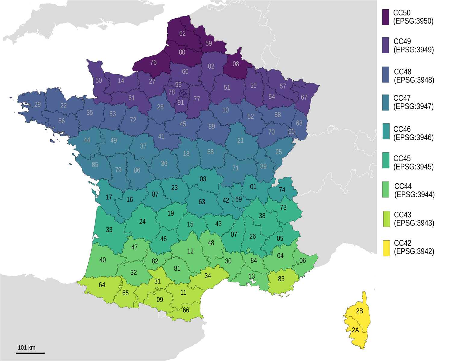 L’IGN a aussi proposé un découpage du territoire français avec des systèmes de projection plus précis en fonction des latitudes. Quand on travaille sur un site précis, il est donc conseillé d’utiliser le système adapté au territoire étudié.